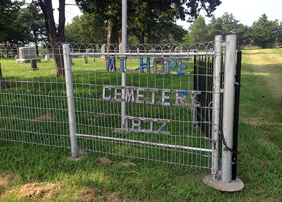Many nineteenth-century rural cemeteries in Kansas are marked with arched metal gateways and various forms of lettering. The spindly arch to Prairie Lawn Cemetery in Wellington covers an impressive span, while tiny, hard-to-find Mt. Hope Cemetery, near Arkansas City, resorts to wooden letters attached to the fence. The Argonia Cemetery sign shows delicate Aesthetic Movement ornament and the Conway Springs Cemetery sign uses the now rarely-used typeface DeVinne.